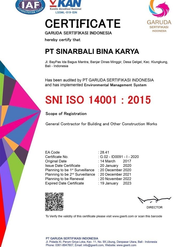 Sinarbali Binakarya telah menerapkan sistem manajemen mutu ISO 9001:2015, sistem manajemen K3 OHSAS 18001:2007, system manajemen lingkungan ISO 14001:2015 sehingga Sinarbali Binakarya dapat menghasilkan produk yang berkualitas serta memberikan pelayanan terbaik untuk pelanggan.